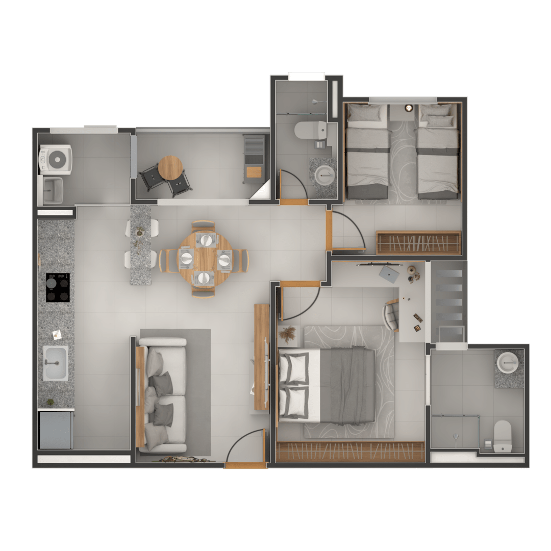 A) Os móveis, objetos de adorno, plantas e qualquer elemento de decoração são mera sugestão para visualização e dimensionamento de ambientes e